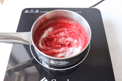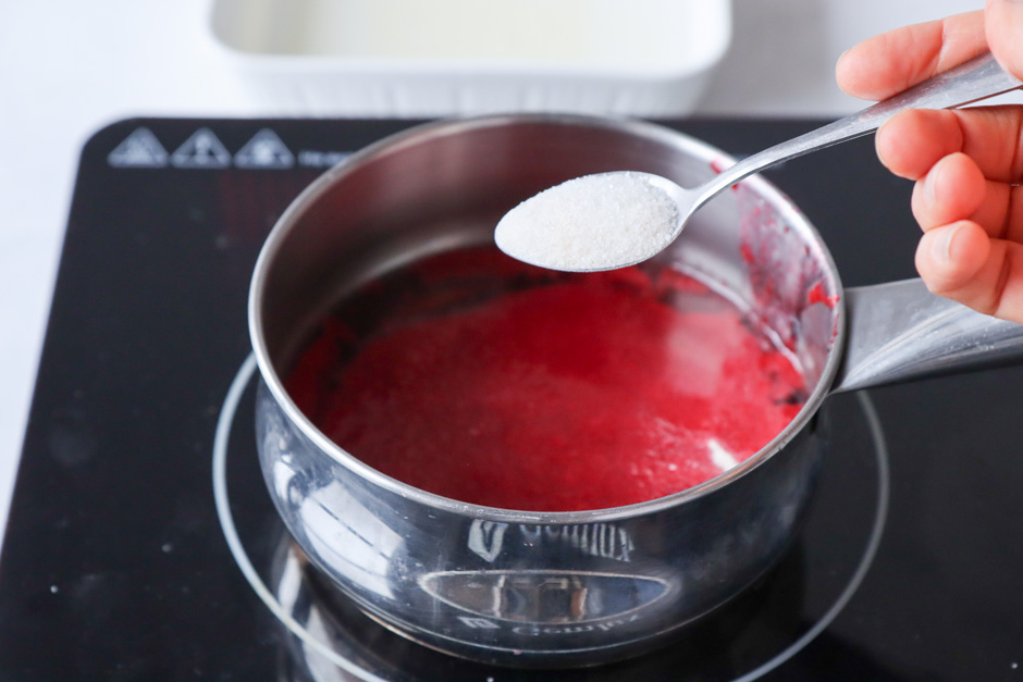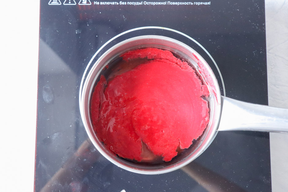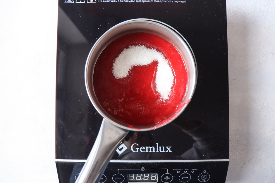Отмерьте на весах сахар, сироп глюкозы, фруктовое пюре (я взяла малиновое пюре, заранее процедила через сито, чтобы избавиться от косточек), воду, желатин и пектин NH. Заменить сироп глюкозы можно патокой. Если нет ничего, тогда делайте на сахаре, но столько блеска не будет. Также нельзя ничем заменить пектин NH. нужен именно он.