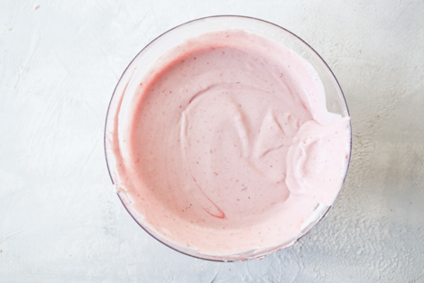 Пока основа остывает, взбейте сливки до состояния мягких пиков. Сливки увеличатся в 2 раза в объеме. Добавьте сливки в пюре и размешайте. Посмотрите каким красивым и нежным получился цвет мусса.