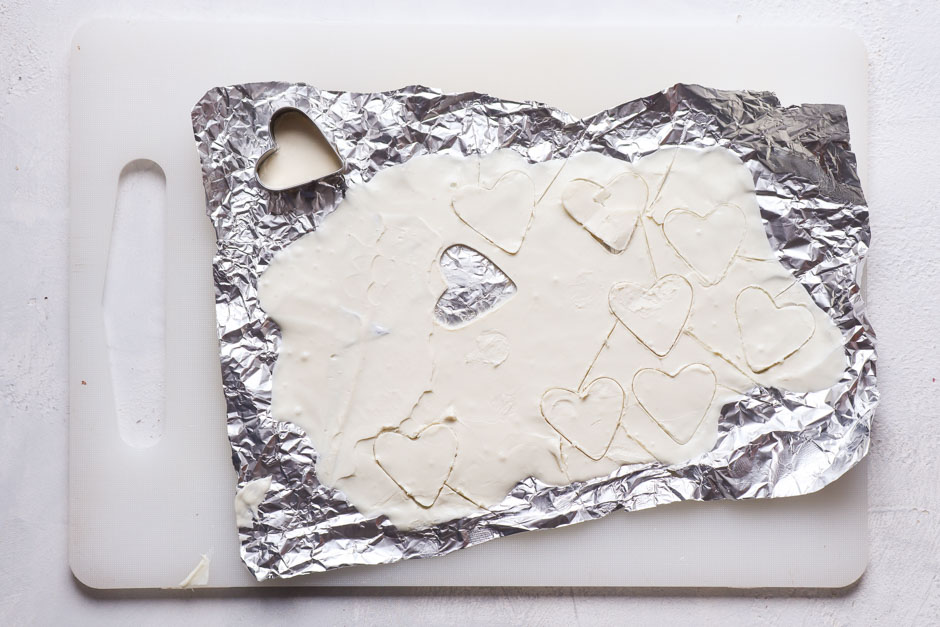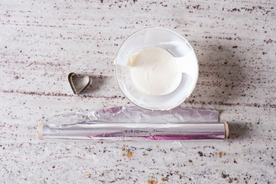Для декора пирожных я сделала сердца из белого шоколада. Из оборудования мне понадобились лишь фольга и вырубка сердце (для бисквита она была маленькой). Шоколад я затемперировала на плите. Вы можете воспользоваться методом темперирования шоколада на замороженных овощах.