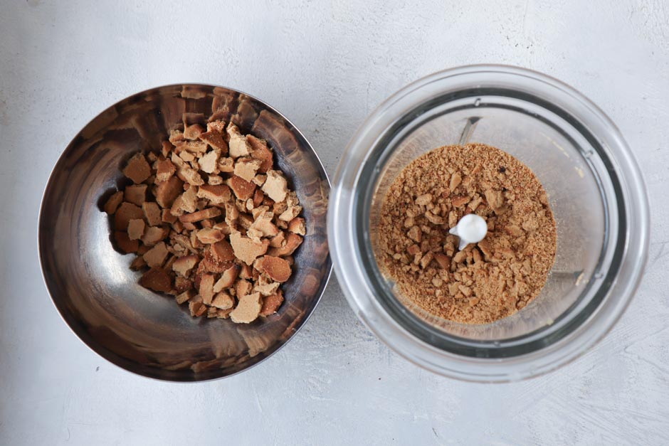 Размолите 2/3 печенья в крошку, остальное печенье порубите на кусочки со стороной до 1 см. Я оставила чуть больше (так моя мама готовила, оставляя кусочки покрупнее). От этого колбаса получилась не идеально гладкой и округлой.