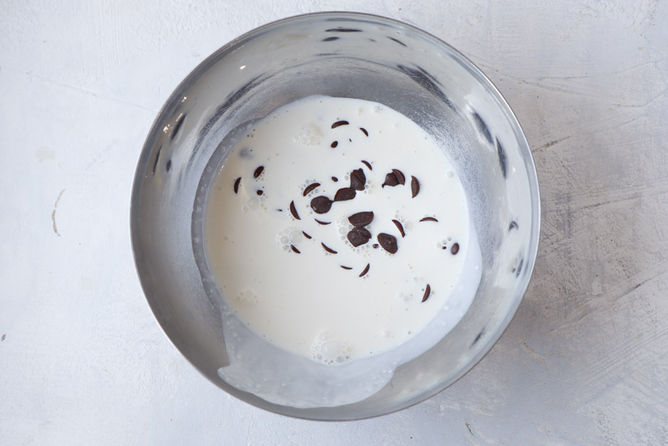 Для начала, из сливок и шоколада приготовим ганаш. Вылейте сливки в сотейник и поставьте на огонь. Когда от жидкости пойдёт пар, вылейте сливки на шоколад. Если вам тяжело отследить этот момент, доведите сливки до кипения, и как только появятся пузыри, снимите их с огня. Ничего страшного в этом нет, просто дайте им немного остыть и также добавьте в шоколад.